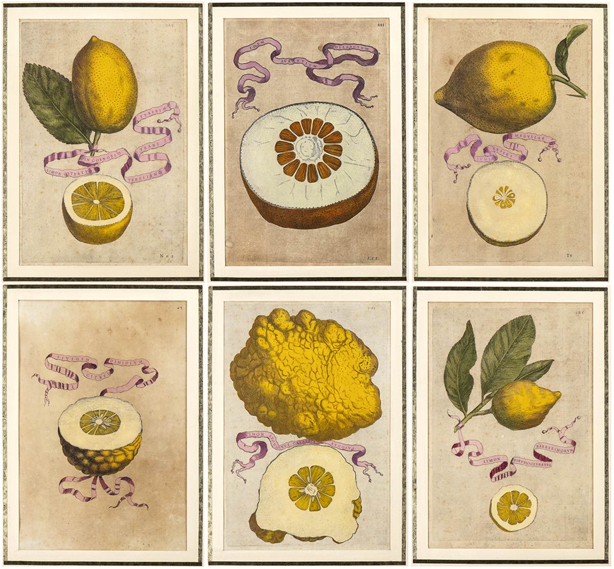 GIOVANNI BATTISTA FERRARI (Siena, 1584 - 1655)<br>Sei incisioni su carta filigranata tratte da "Hesperides Sive de Malorum Aureorum Cultura et Usu Libras Quatuor" con studi di limone, 1646