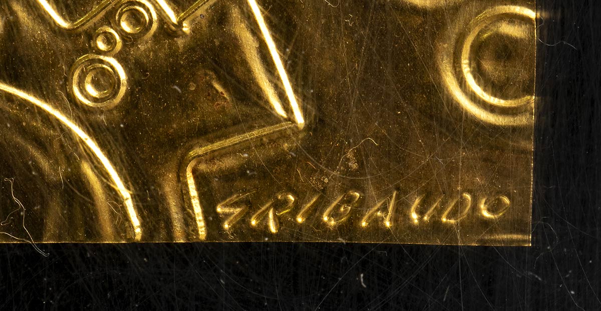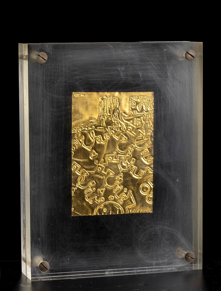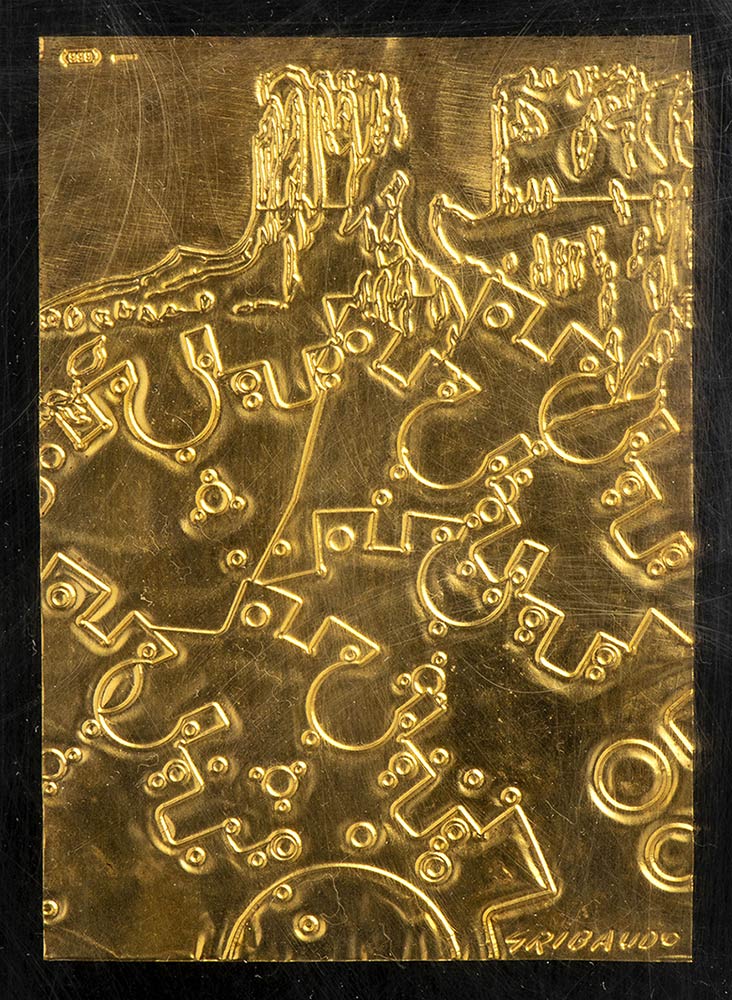Incisione su lamina d'oro 999, 12 x 8 x 0,1 cm (22 x 17 x 4,5 la teca in plexiglass)
