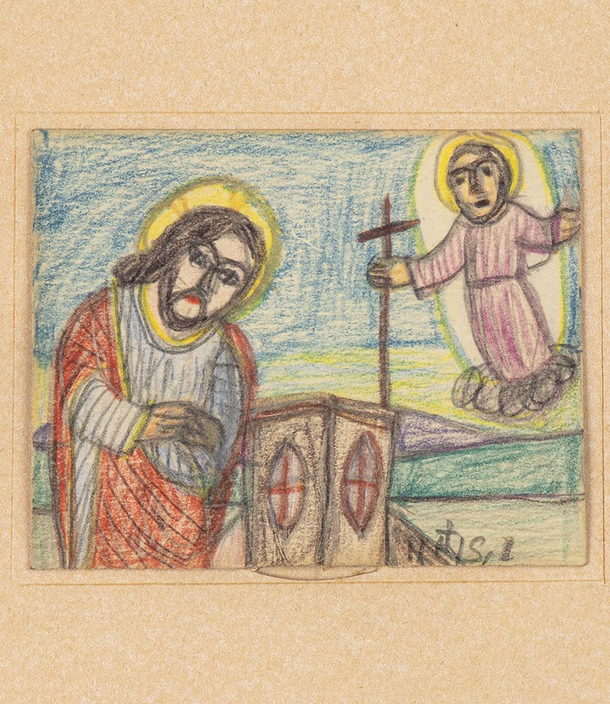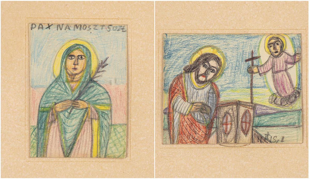 NIKIFOR KRYNICKI (Krynica-Zdrój, 1895 - Folusz, 1968)<br>1. Vergine con ramoscello d'ulivo;<br>2. Mosè riceve le Tavole della Legge