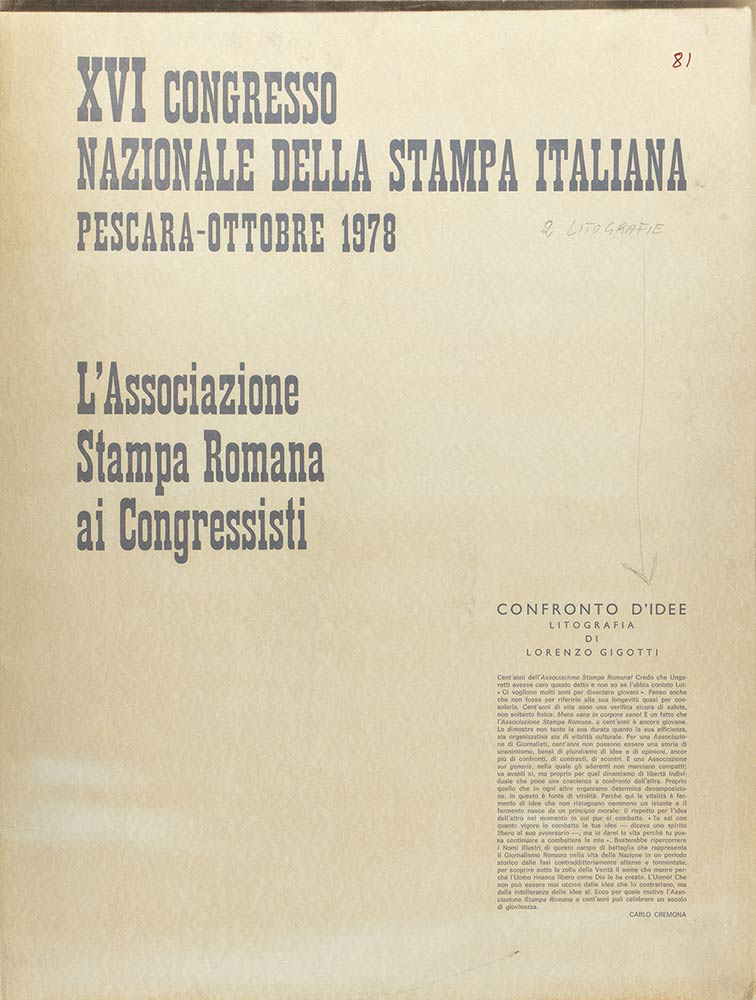 Due litografie realizzate dall'Associazione Stampa Romana ai Congressisti per il XVI Congresso Nazionale della Stampa Italiana", Pescara, ottobre 1978.