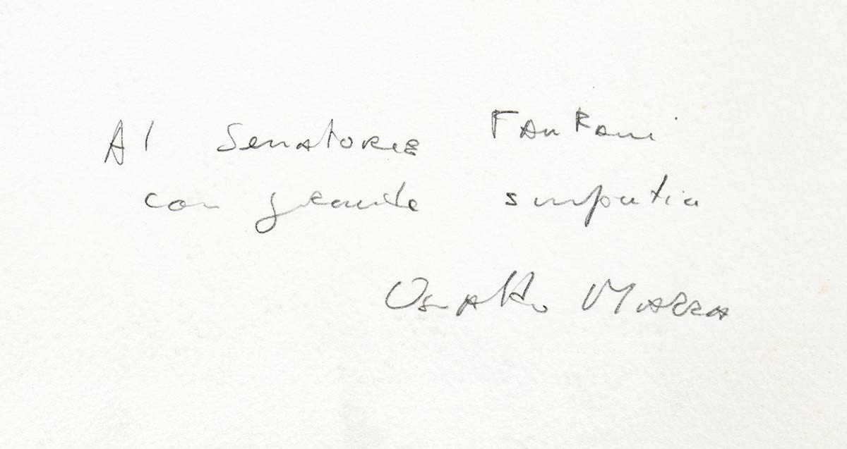 Dedica al retro: "Al Senatore Fanfani, con sincera simpatia, Osvaldo Marra"