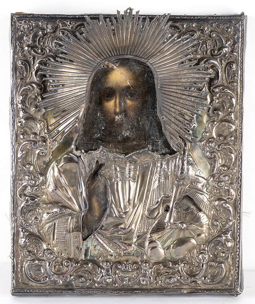 tempera su tavola con riza in argento, raffigurante Cristo Pantocratore. Serie completa di marchi per l'argento al titolo di 84 zolotniks (875/1000) in uso a San Pietroburgo nel 1853, assaggiatore Ivan Eduard / Eduard Fyodorovich. Dimensioni 31 x 26 x 2 cm. Stato di conservazione: **** buono (difetti).