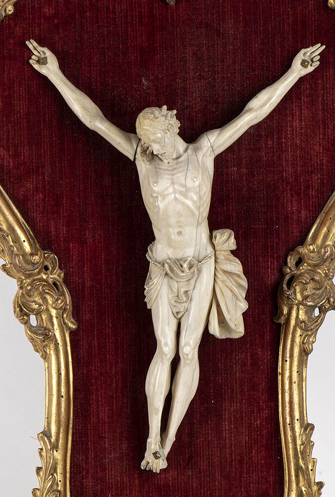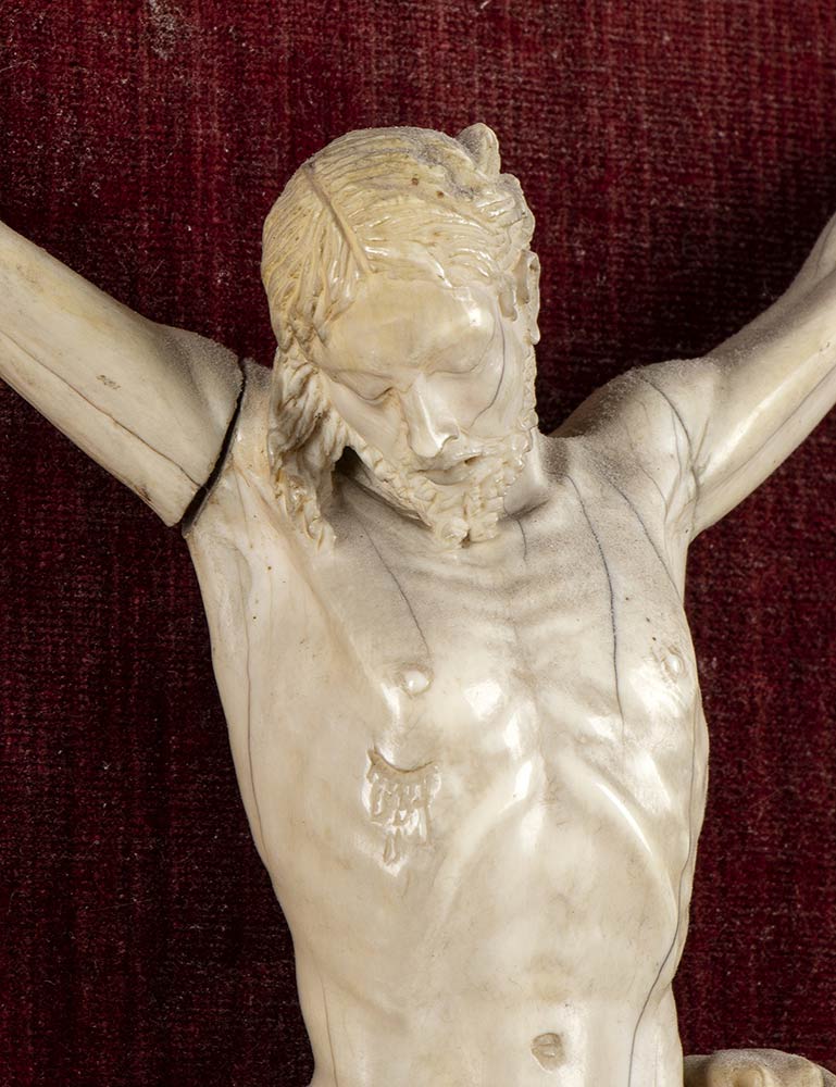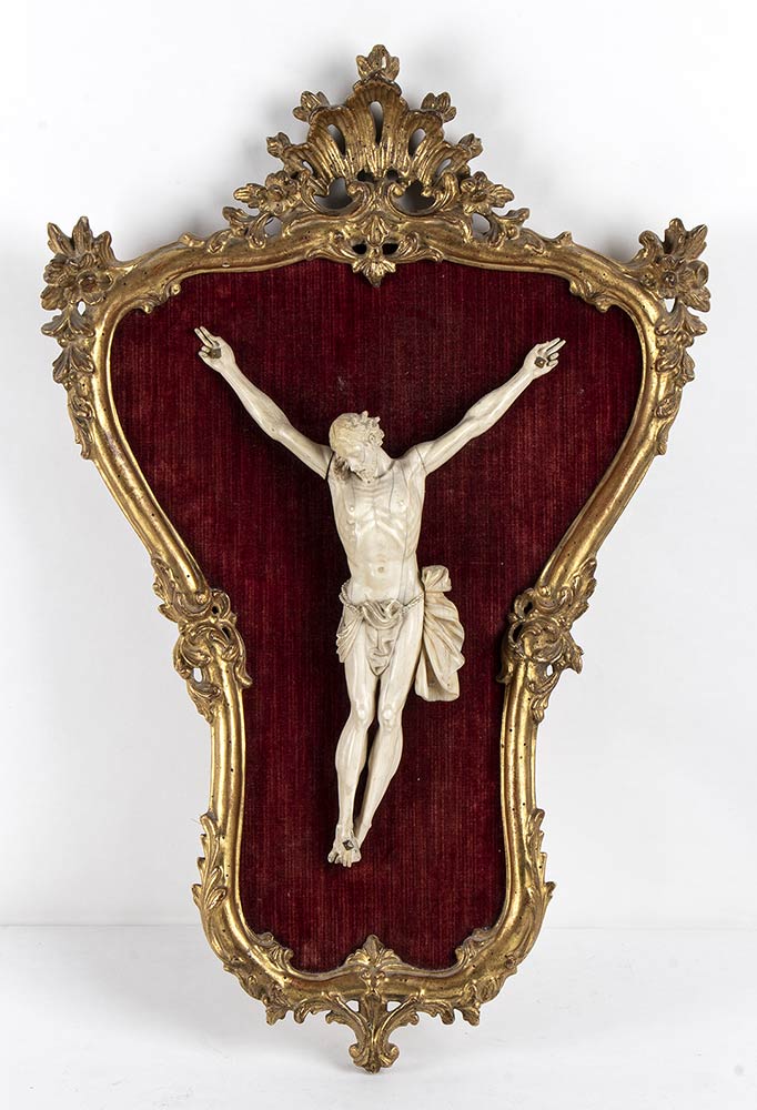 "Corpus Christi" in avorio di elefante scolpito (Loxodonta africana Blumenbach, 1797 o Elephas maximus Linnaeus, 1758) con cornice lignea in legno dorato. Dimensioni cornice 83 x 41,5 cm, dimensioni scultura 33 x 23 cm. Peso totale 1400 gr circa. Stato di conservazione: **** buono (difetti ad un piede). Accompagnato da certificato di autenticità Ce.S.Ar. Centro Studi Archeometrici (pre-1947).
