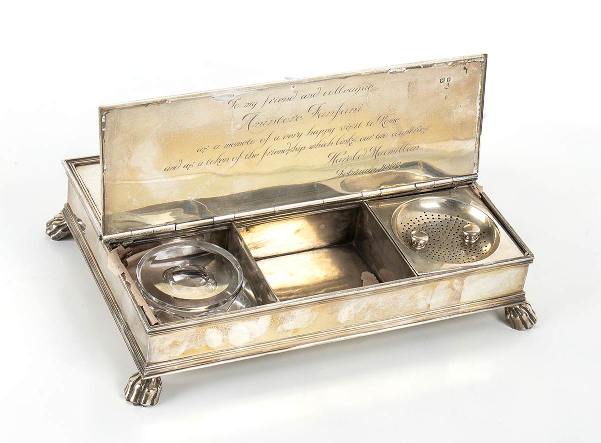 <br>Calamaio in argento 925/1000 con dedica di Harold Macmillan<br>al Senatore Amintore Fanfani - Londra 1962, argentiere Garrard & Co.