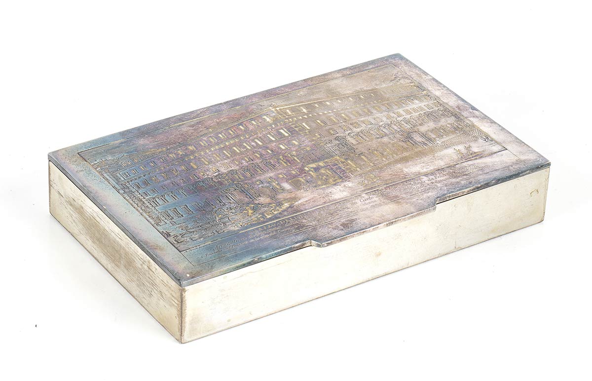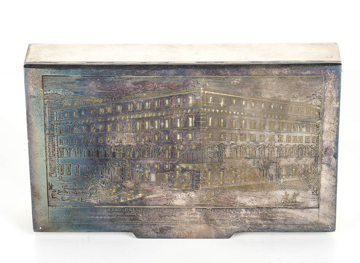 di forma rettangolare, il coperchio inciso con la raffigurazione di Palazzo Chigi in piazza Colonna a Roma. Punzonata "800 e *391 FI". Dimensioni 3 x 18 x 11,5 cm. Peso 309 gr. Stato di conservazione: **** buono.