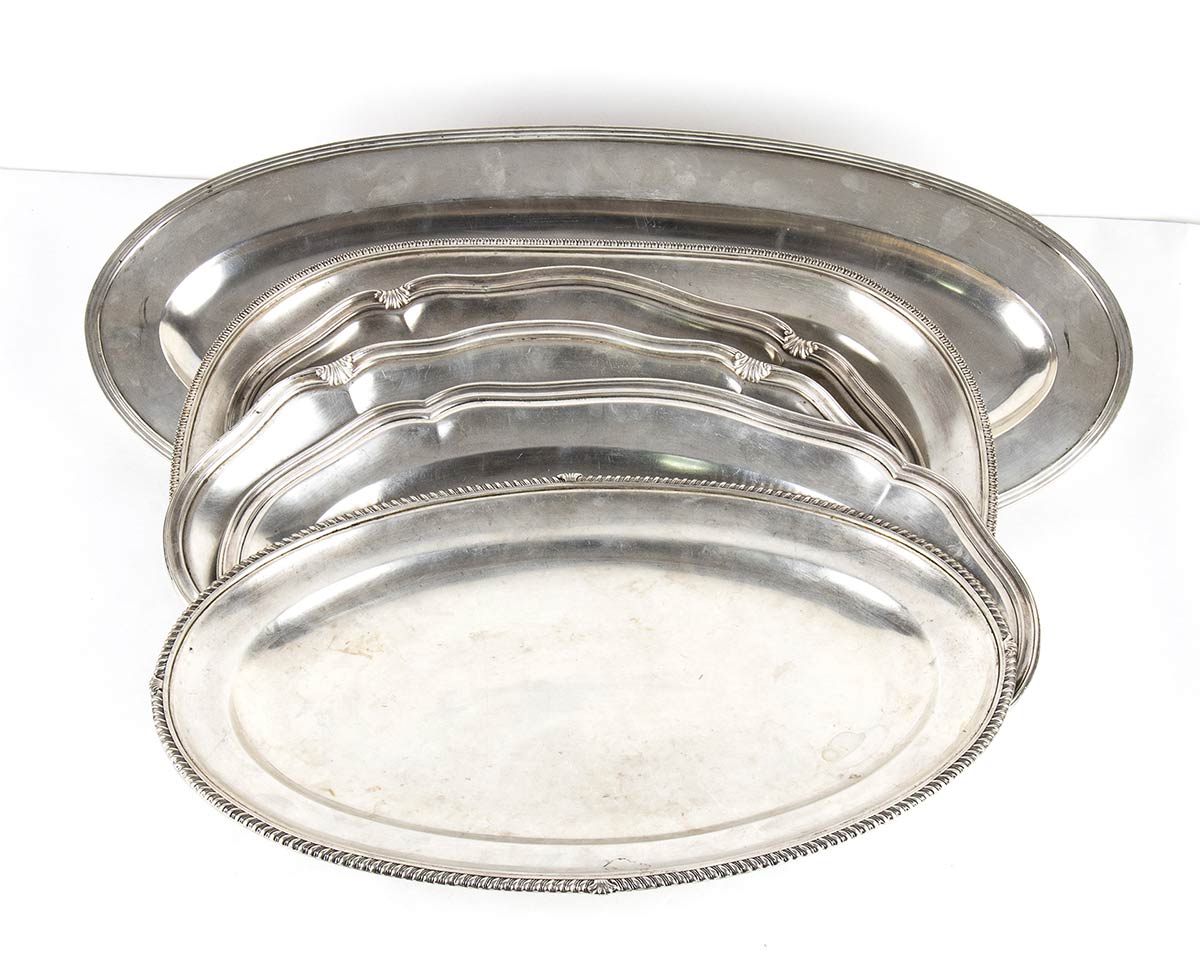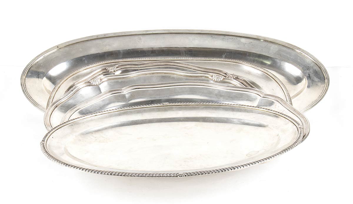 di forma ovale di diverse misure. Dimensioni, pesi e marchi: punzonato "Spoggi", peso 2020 gr; punzonato "800" e marchio di epoca fascista 1935-1945, peso 1351 gr, dimensioni 50 x 33 cm; punzonato "800" e marchio di epoca fascista 1935-1945, peso 953 gr, dimensioni 45 x 28,5 cm; punzonato "800" e "Ventrella Roma", peso 1247 gr, dimensioni 47 x 31 cm; punzonato "800" e "1 AL", peso 1503 gr, dimensioni 49 x 33 cm; punzonato "800, Miracoli & Co., Milano", peso 1920 gr, dimensioni 52 x 36,5 cm. Peso totale 8994 gr. Stato di conservazione: *** discreto.
