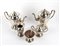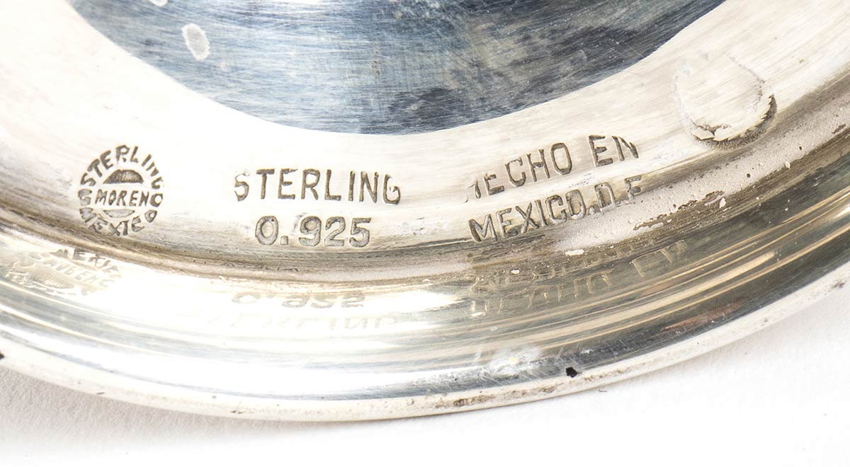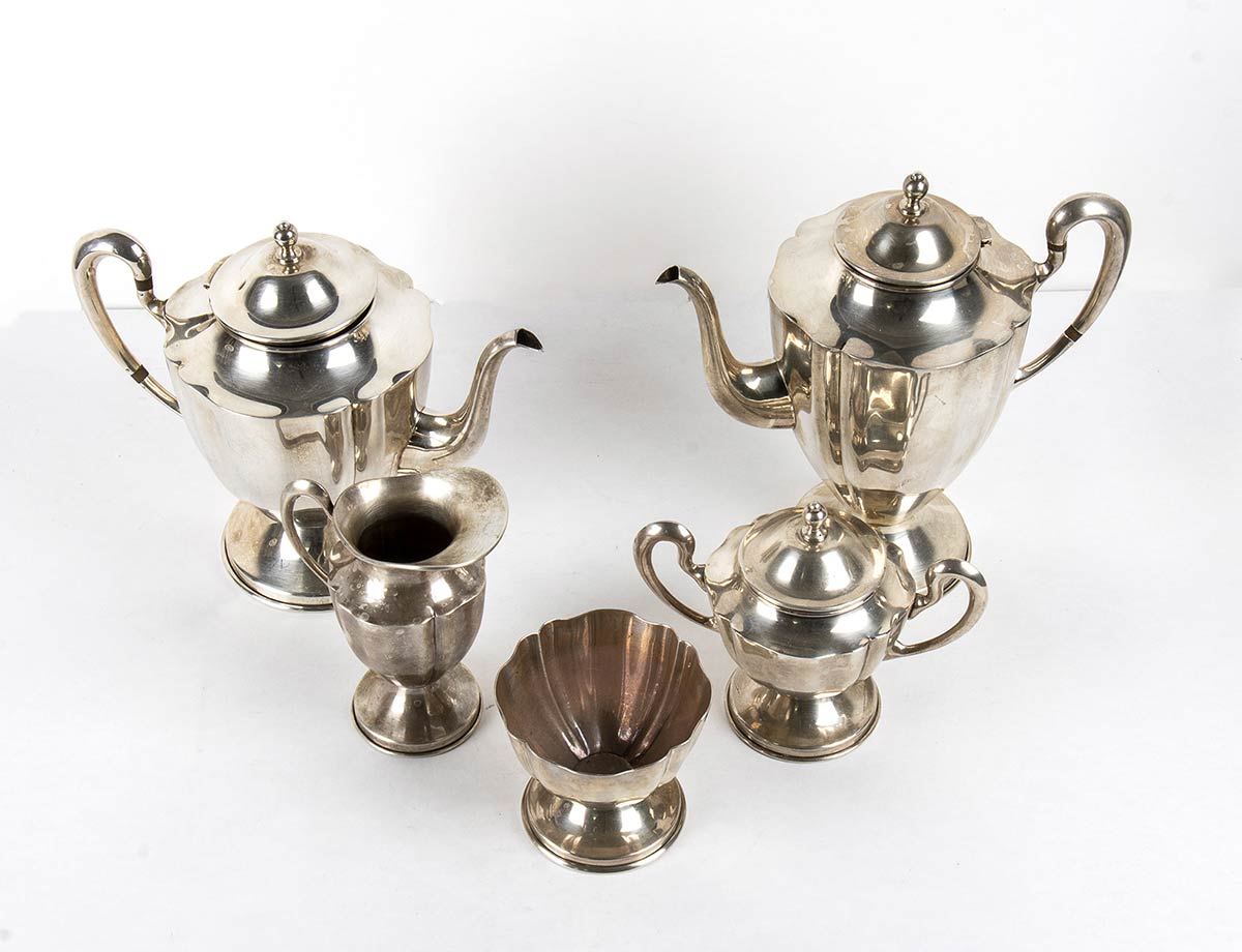 di forma sagomata poggianti su piede circolare con manici ad ansa. Punzonati "Sterling, Moreno, Mexico, 0,925 Hecho en Mexico D.F.". Teiera 24 x 26 x 14,5 cm, peso 870 gr; caffettiera 27 x 25,5 x 14 cm, peso 887 gr; zuccheriera, diametro 10,5 cm, altezza 9,5 cm, peso 204 gr; lattiera 15 x 12 x 8 cm, peso 309 gr; zuccheriera con coperchio 15 x 18,5 x 10,5 cm, peso 403 gr. Peso complessivo 2670 gr. Stato di conservazione: **** buono.