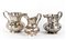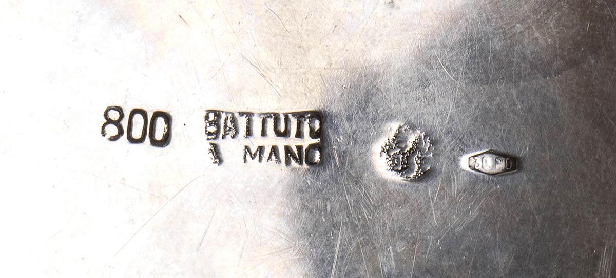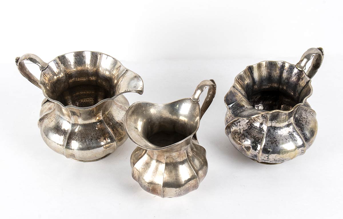 in argento martellato, punzonate "800" e marchi italiani della metà del XX secolo. Dimensioni 17 x 20 x 16,5 cm, peso 624 gr; 17 x 22 x 17 cm, peso 703 gr; 15 x 18 x 13 cm, peso 475 gr. Peso totale 1802 gr. Stato di conservazione: **** buono (una con ammccaccature).