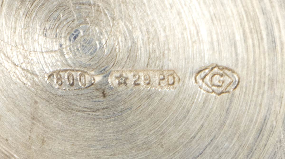 punzonata "800, * 29 PD e G", argentiere Greggio. Diametro 13,5 cm, altezza 16,5 cm. Peso 540 gr. Stato di conservazione: *** discreto.