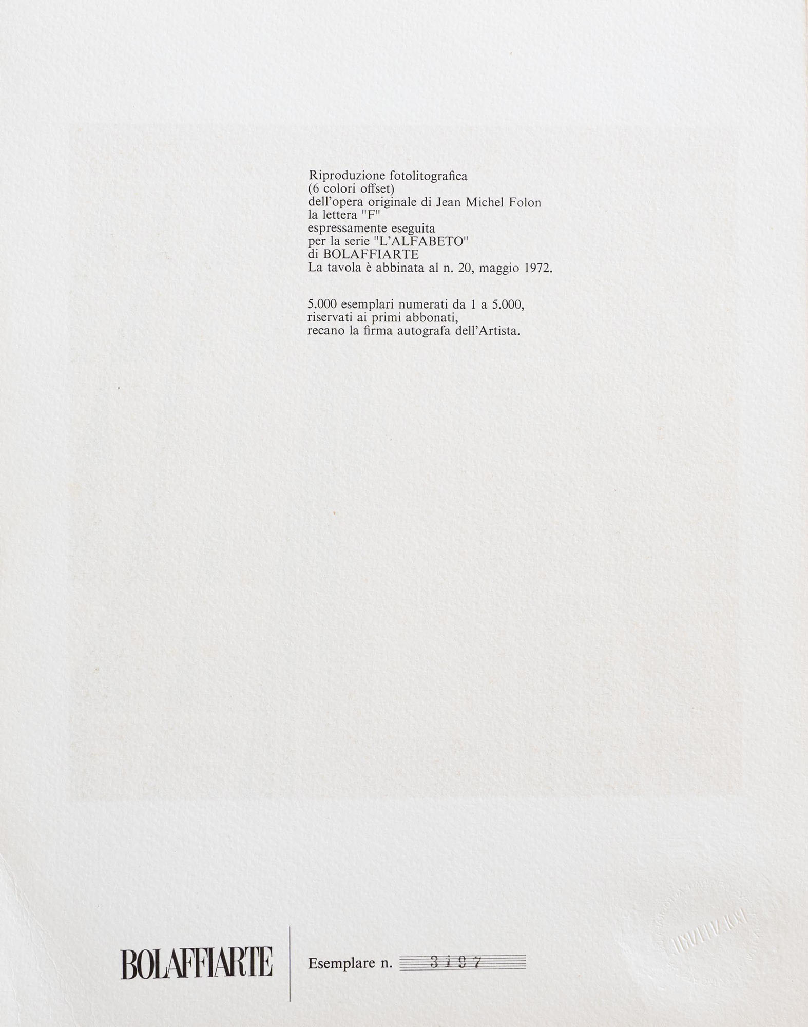 JEAN MICHEL FOLON, Lettera "F" eseguita per la serie "L'ALFABETO DI BOLAFFIARTE"