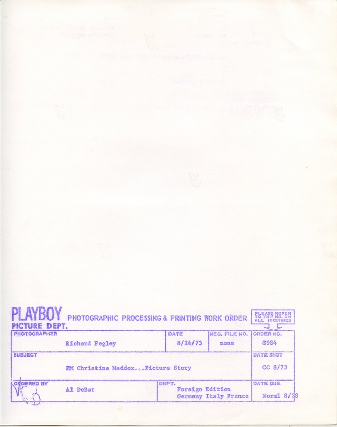 Christine Maddox by Richard Fegley. Published 4-1973. Lot of two prints on Agfa baryta paper, Playboy's clichè printed on back. Excellent 1973 25 x 20 Print 24 x 16