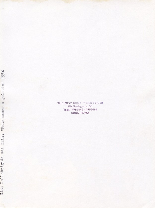 Gina Lollobrigida during " Pane, amore e gelosia".Print on single coated paper. Agency stamp on back " The New Roma Press Photo". Perfect conditions 1954 18 x 24