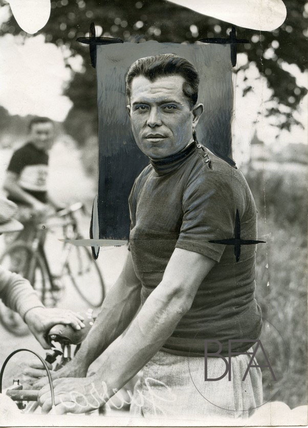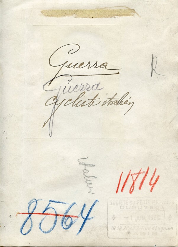 Portrait of Learco Guerra during the TDF of 1930. Hand-inked print on sigle coated paper. Stamp of Societé Du Petit Parisien with date and handwritten notes on back. Typographic vertical fold, beautiful condition 1930 13 x 18