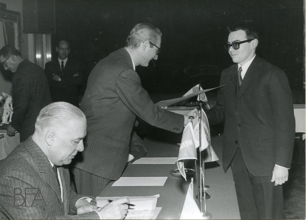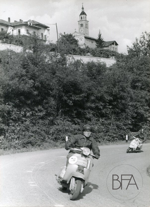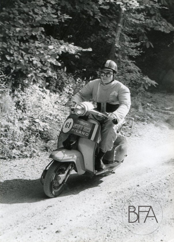 Lambretta Club Milano, portraits of driver during a time-trial competition and ceremony. Lot of eleven photographic print on single coated paper. Ink stamp of "Bonetti fotoreportage on back. Very good conditions 1965 ca. 17,5 x 13