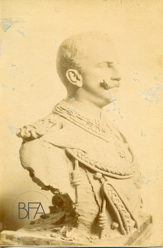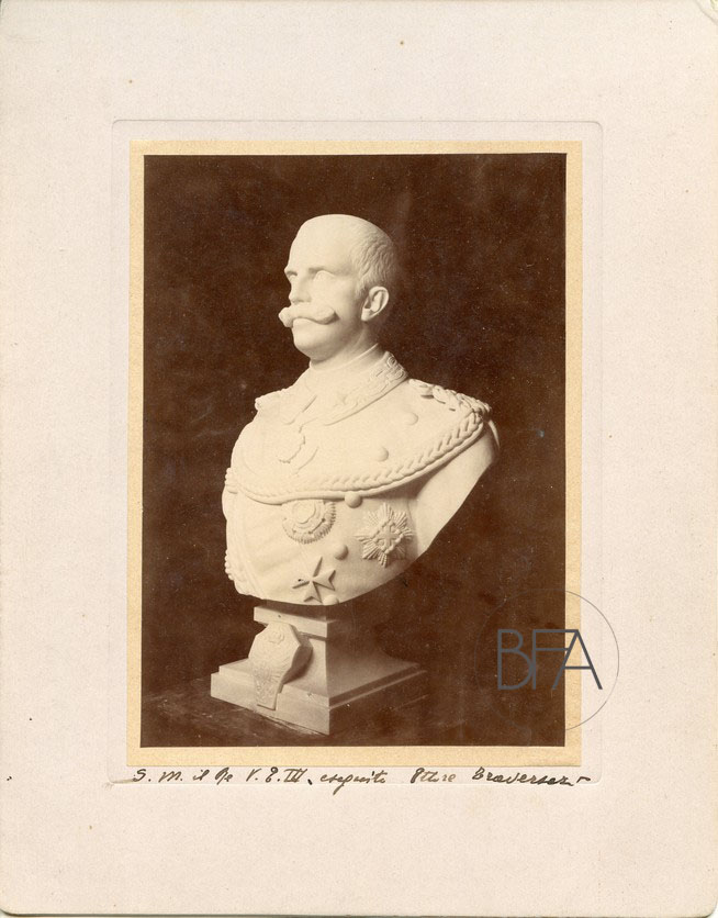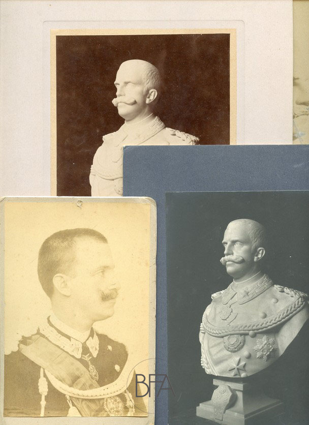 Bust of Vittorio Emanuele III by Ettore Traversari. Lot of four photographic prints applied on cardboard, one of which with artist's autograph. Albumen and silver gelatine print. Very good conditions