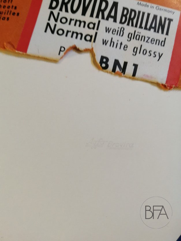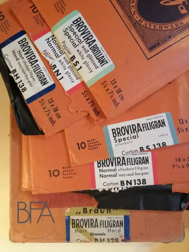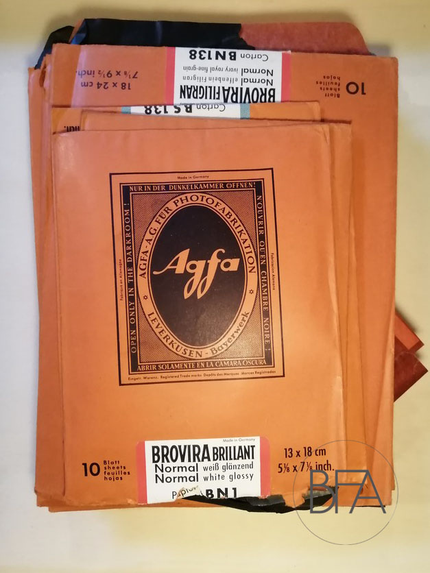 Lot of vintage Agfa Brovira paper boxes. Four bags 13 x 18 cm, three bags 18 x 24 and one box of 18 x 24 “Filigran”.Not sealed, inactive paper, for collectioner only 1950 ca.