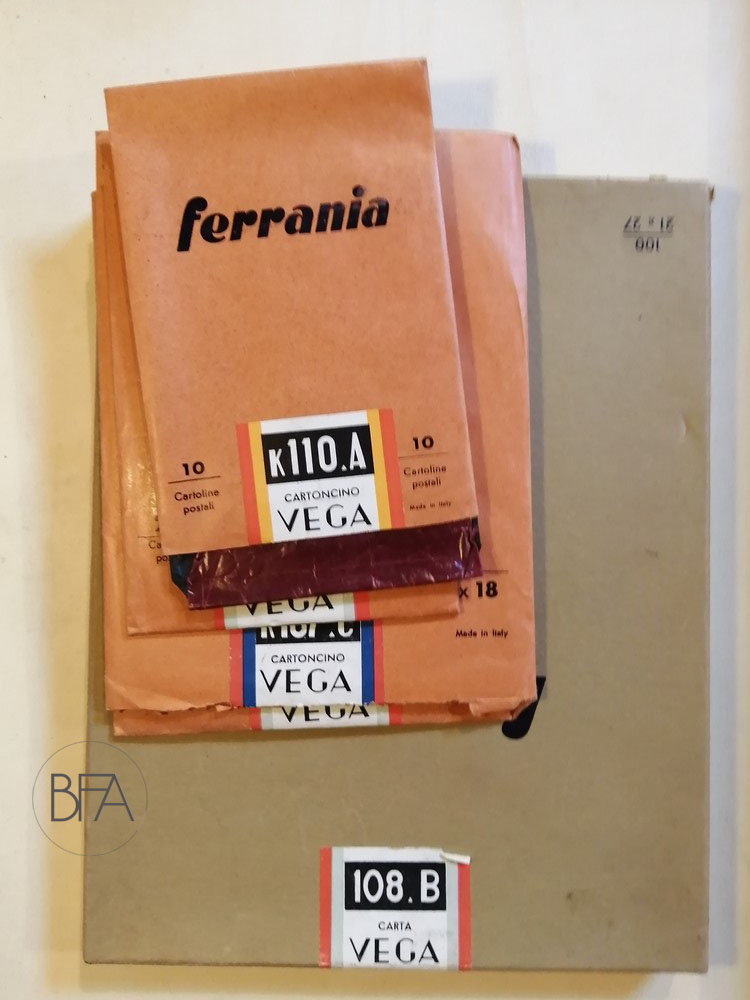 Lot of Ferrania paper boxes. Two bags of postcard-size, two bags 13 x 18, one box 21 x 27. Not sealed, inactive paper, for collectioner only 1960 ca.