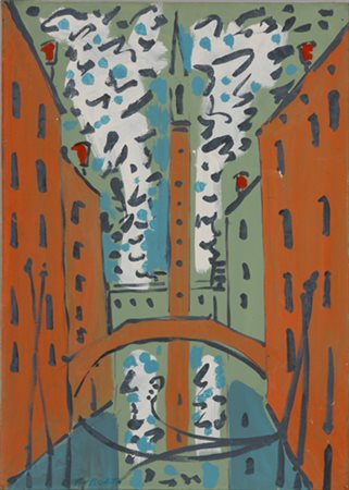 Giulio Turcato (Mantova, 1912 – Roma, 1995). Rio veneziano, 1971-‘72. Olio su tela, firma in basso a sinistra, con cornice. Sul retro firma dell’artista. Allegata autentica su foto rilasciata dall’Archivio Turcato al numero di repertorio EP200412BM10MB. cm50x70.