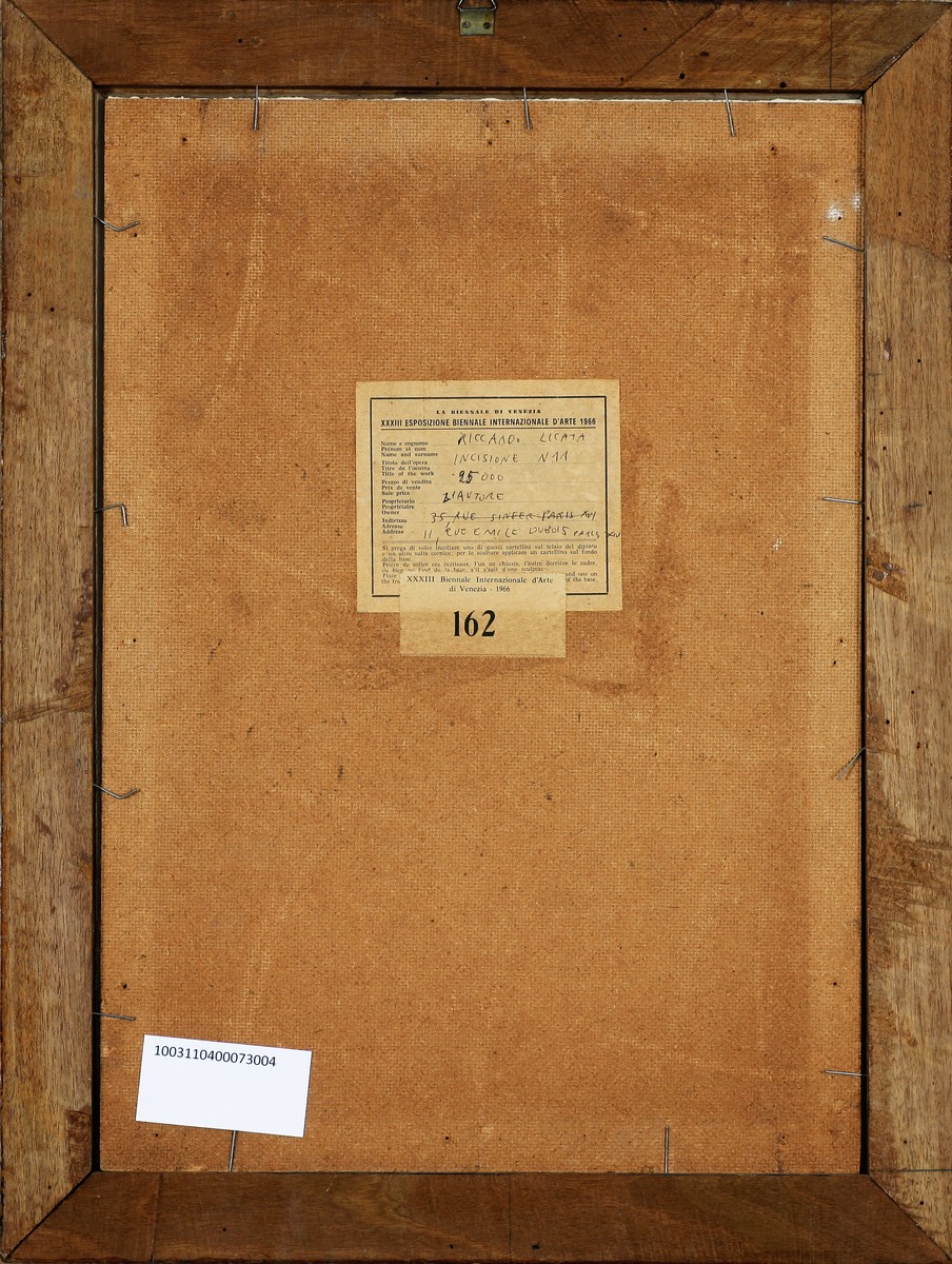 LICATA RICCARDO (n. 1929) Incisione n.11. 1966. Serigrafia. Cm 32,50 x 45,00. Tiratura:1/50. Firma, anno e tiratura a matita in basso. Al retro cartiglio descrittivo della Biennale di Venezia -XXXIII Esposizione Biennale Internazionale d'Arte 1966. Cornice presente