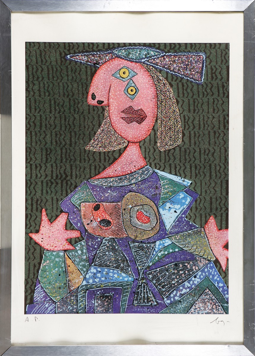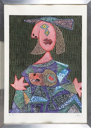 BAJ ENRICO (1924 - 2003) Senza titolo. Serigrafia e floccaggio. Cm 70,00 x 100,00. P.A. Firma e tiratura in basso a matita. Dimensioni lastra: cm 80x60. Cornice presente