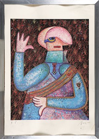 BAJ ENRICO (1924 - 2003) Senza titolo. Serigrafia e floccaggio. Cm 70,00 x 100,00. P.A. Opera danneggiata in vari punti sul passpartout. Tiratura e firma in basso a matita. Dimensioni lastra: cm 80x60. Cornice presente