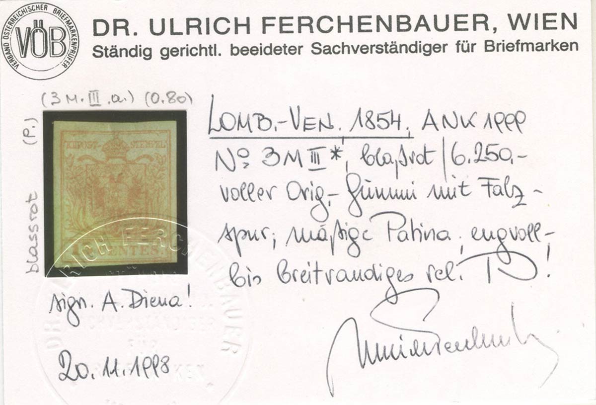 1854, 15c. N.20d Rosa Salmone carta a macchina, nuovo con gomma. (A+) ( A. Diena, Cert. Ferchenbauer) (Cat.4.000++)