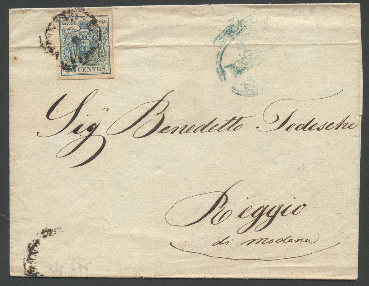 Lettera per Reggio affrancata per 45c. (tariffa di 1° porto per la 3° distanza per il ducato di Modena e Parma) tramite un 45c. N.12 Azzurro. (B) (Cat.325)