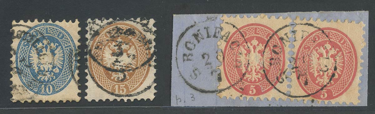 Filigrana Lettere, 4 esemplari (N. 43d in coppia, 44d, 45d) il 15s. Presenta...