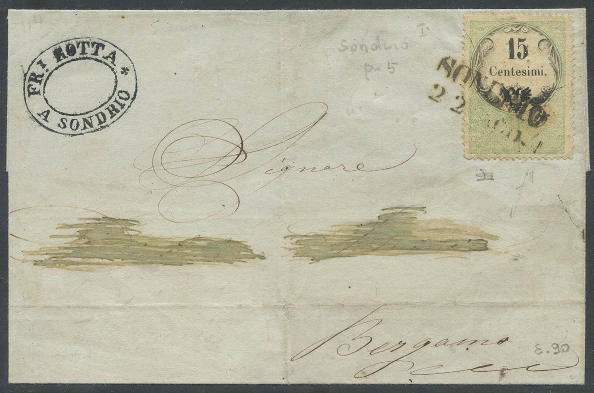 Lettera da Sondrio a Bergamo affrancata con una marca da bollo da 15c. N.3....