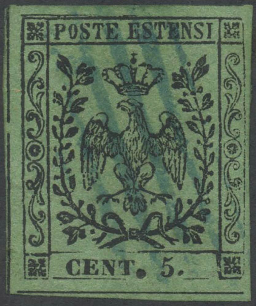 1852, 5c. N.8 Verde Oliva con punto grosso dopo ''Cent'' (N.8e), usato. (A+) (Cat.1.100)