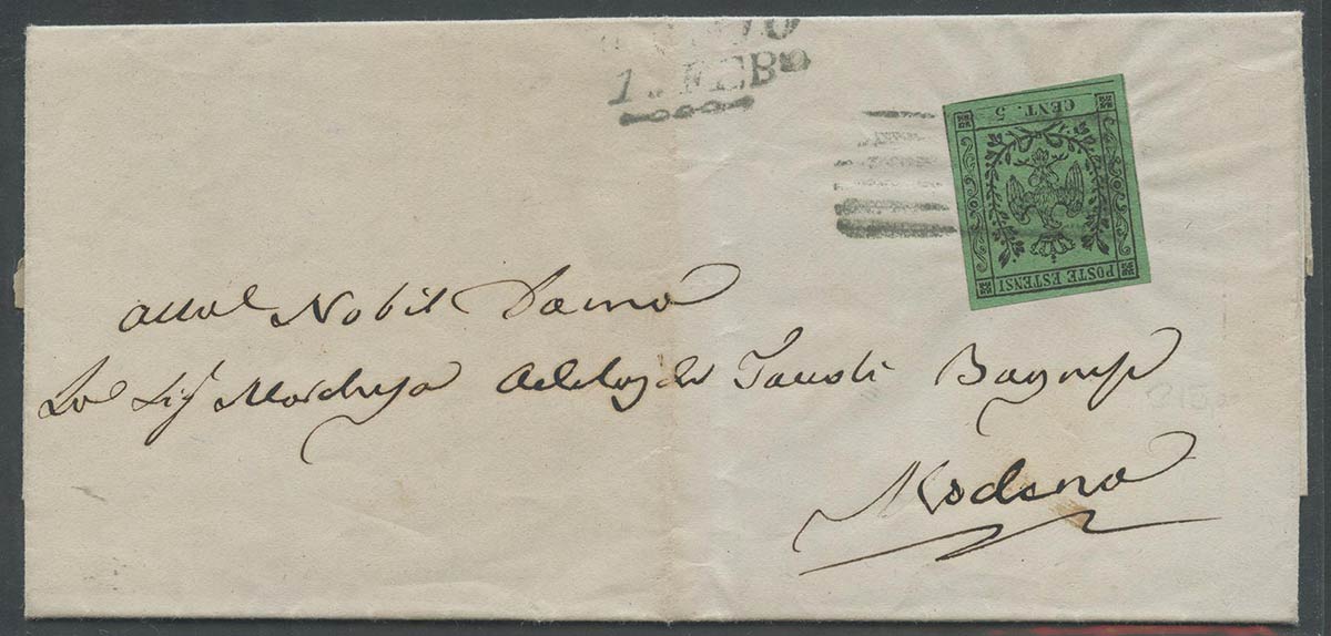 Lettera da Reggio per Modena affrancata con un 5c. Verde senza punto dopo la cifra N.1. Qualità A