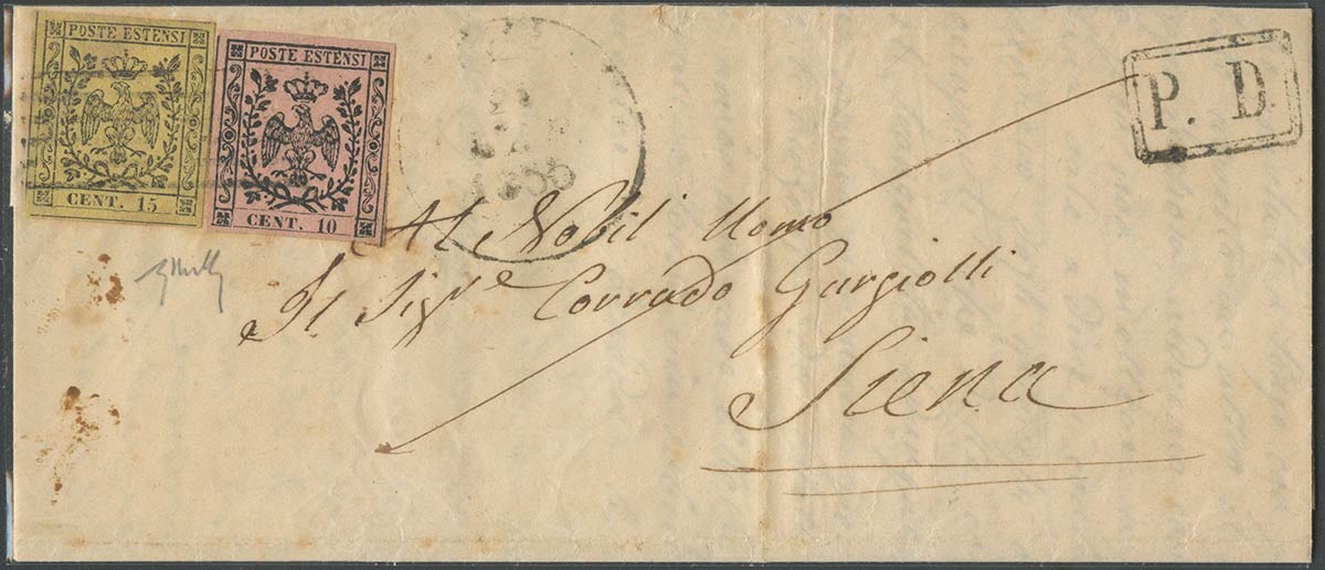 1855, Lettera da Fivizzano per Siena affrancata per 25c. Tramite un 10c, N. 2...