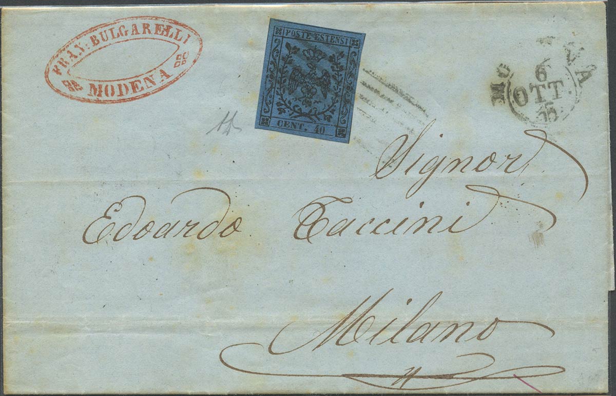 06.10.1855, lettera da Modena per Milano affrancata con un 40c. N 6 Azzurro...