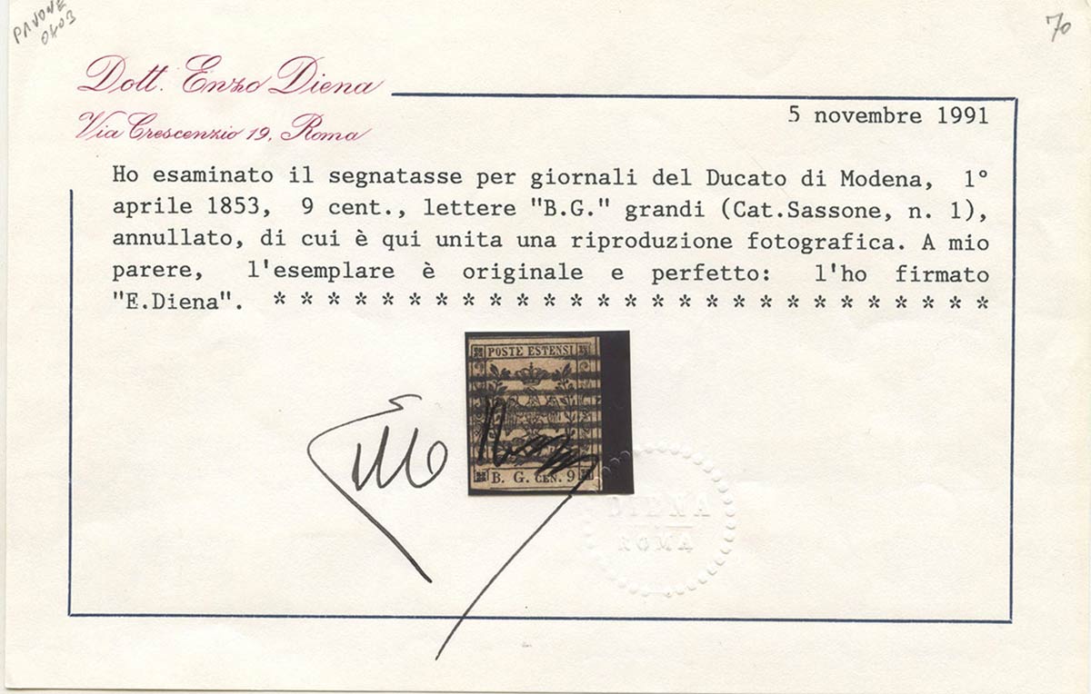Segnatasse per giornali, 9c. N.1 Violetto Grigio, usato. (A+) (Cert. En. Diena) (Cat.5.500)