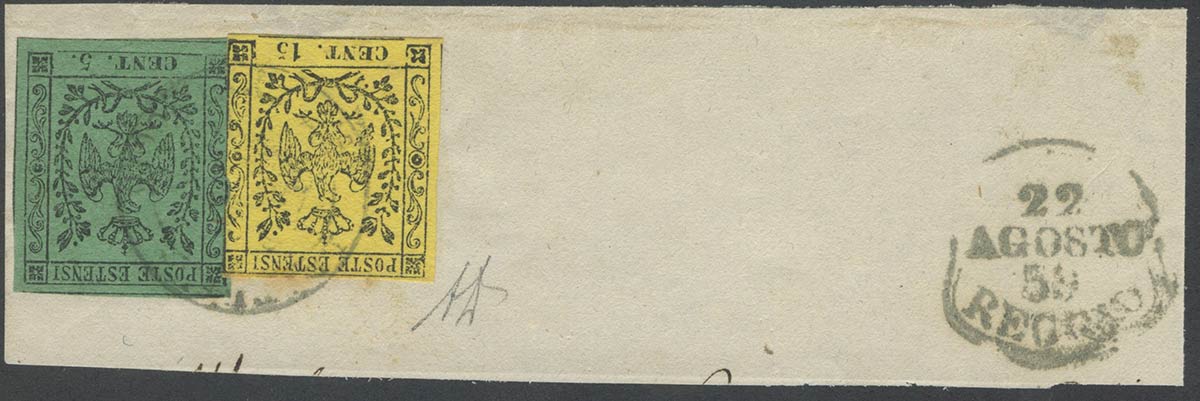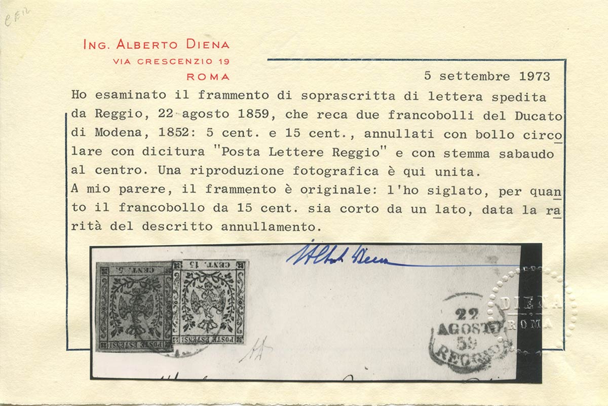 22.08.59, frammento di lettera affrancata per 20c. Tramite un 5c. N.7 Verde e un 15c. N.3 Giallo. Sull'affrancatura l'annullo risorgimentale '' Posta Lettere Reggio'' con stemma sabaudo al centro. (A-) (cert. A. Diena) (Cat.--)