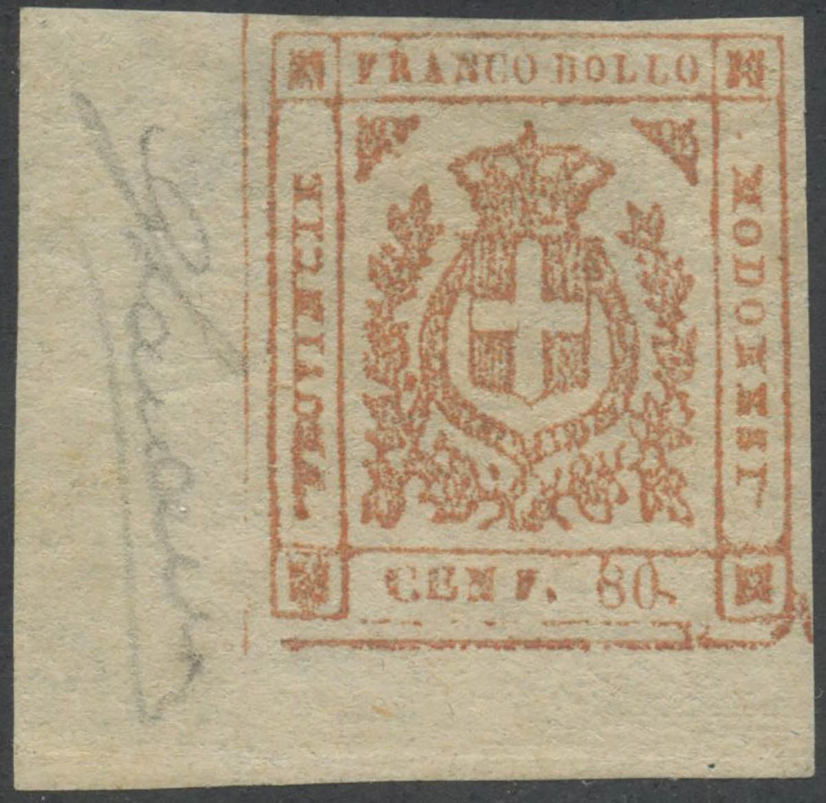 1859, 80c. N.18 Bistro Arancio angolo di foglio a sinistra, nuovo con gomma integra. (Cat.600++)