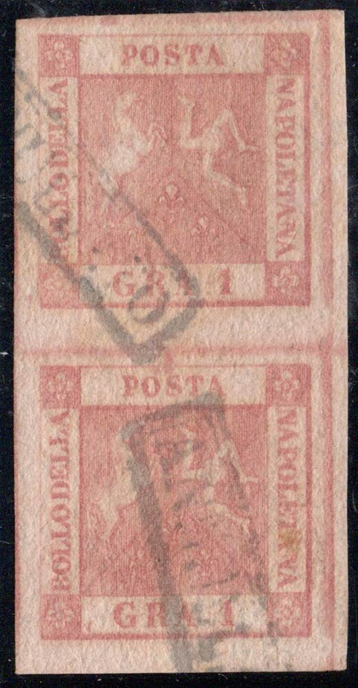 1858, N.4 Rosa Carminio in coppia verticale, usata. (A+) (Cat.175)