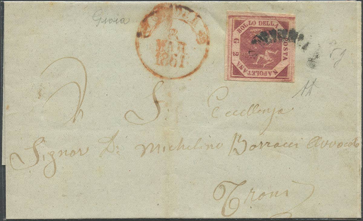 03.03.1861, Lettera da Goja per Trani affrancata con un 2gr. N.7f Carminio Cupo. Sull'affrancatura lo svolazzo tipo 1 Gioja(13pt.). (A+) (A. Diena) (Cat.9.400)