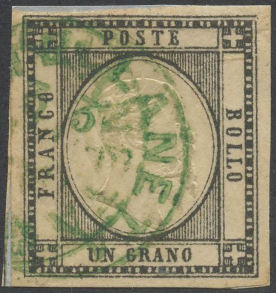 1861, 1gr N.19 Nero annullato con il cerchio semplice di Castellaneta in verde su minimo frammento (10pt.). Doppia effige ben discostata. (A+)