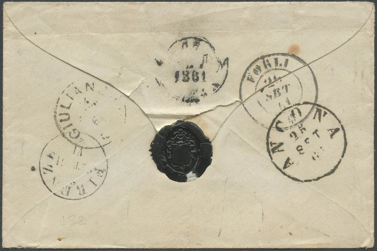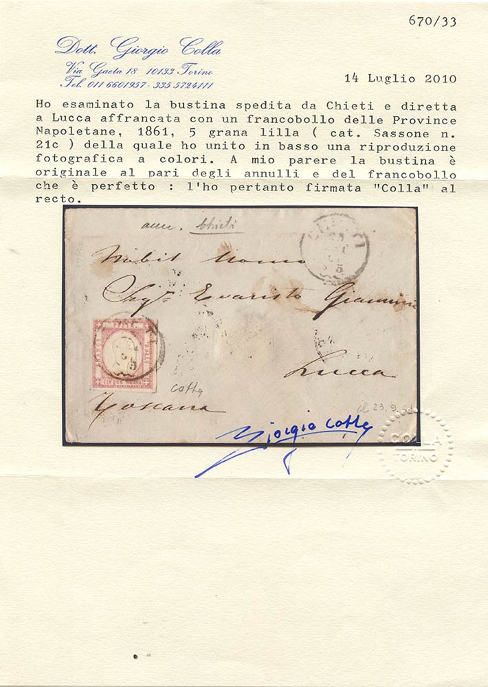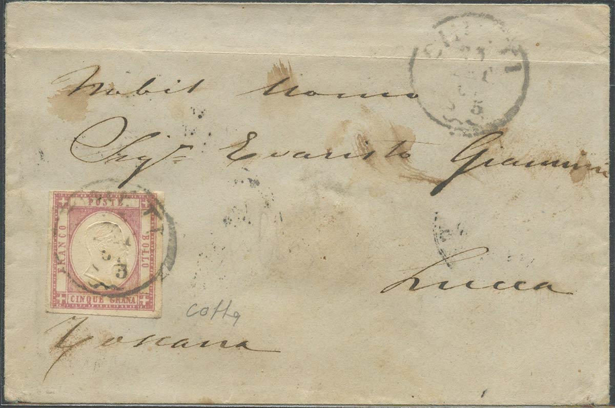 23.09.1861, Lettera da Chieti per Lucca affrancata con un 5gr. N.21b Rosa Lilla spedita per via di terra. (A) (Cert. Colla) (Cat.1500++)