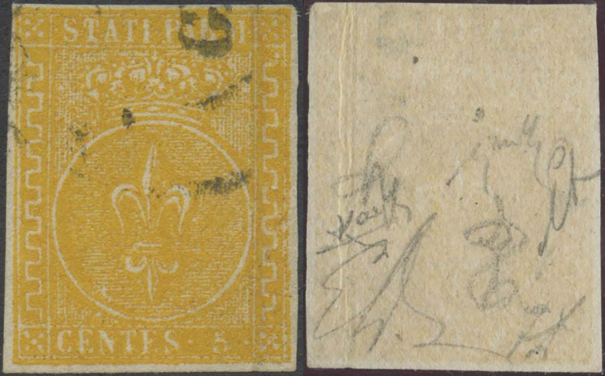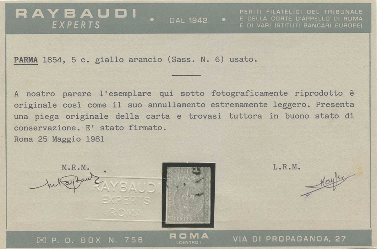 1853, 5c. N.6 Giallo Arancio con una decisamente poco comune piega di carta originale (precedente alla stampa) usato. (A+) (Chiavarello, E. Diena, Vaccari, A. Diena, cert. Raybaudi) (Cat.--)