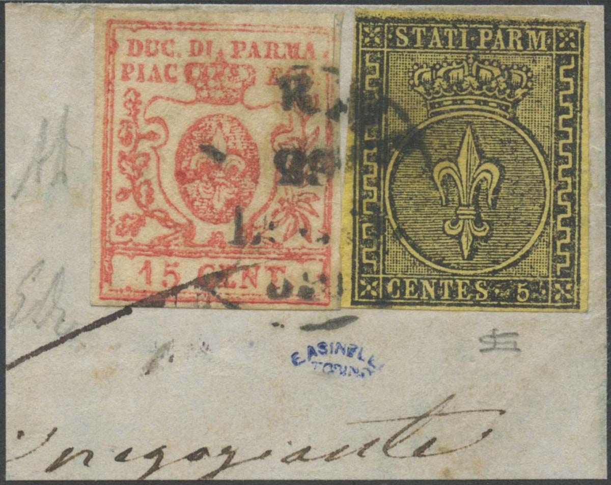 29.07.1859, affrancatura mista I° emissione + III° emissione composta da 5c. N.1 Giallo Arancio e 15c. N.9 Vermiglio, in periodo di 2° Governo Provvisorio. (A-) (A. Diena, E.Diena, Timbro E. Asinelli) (Cat.--)