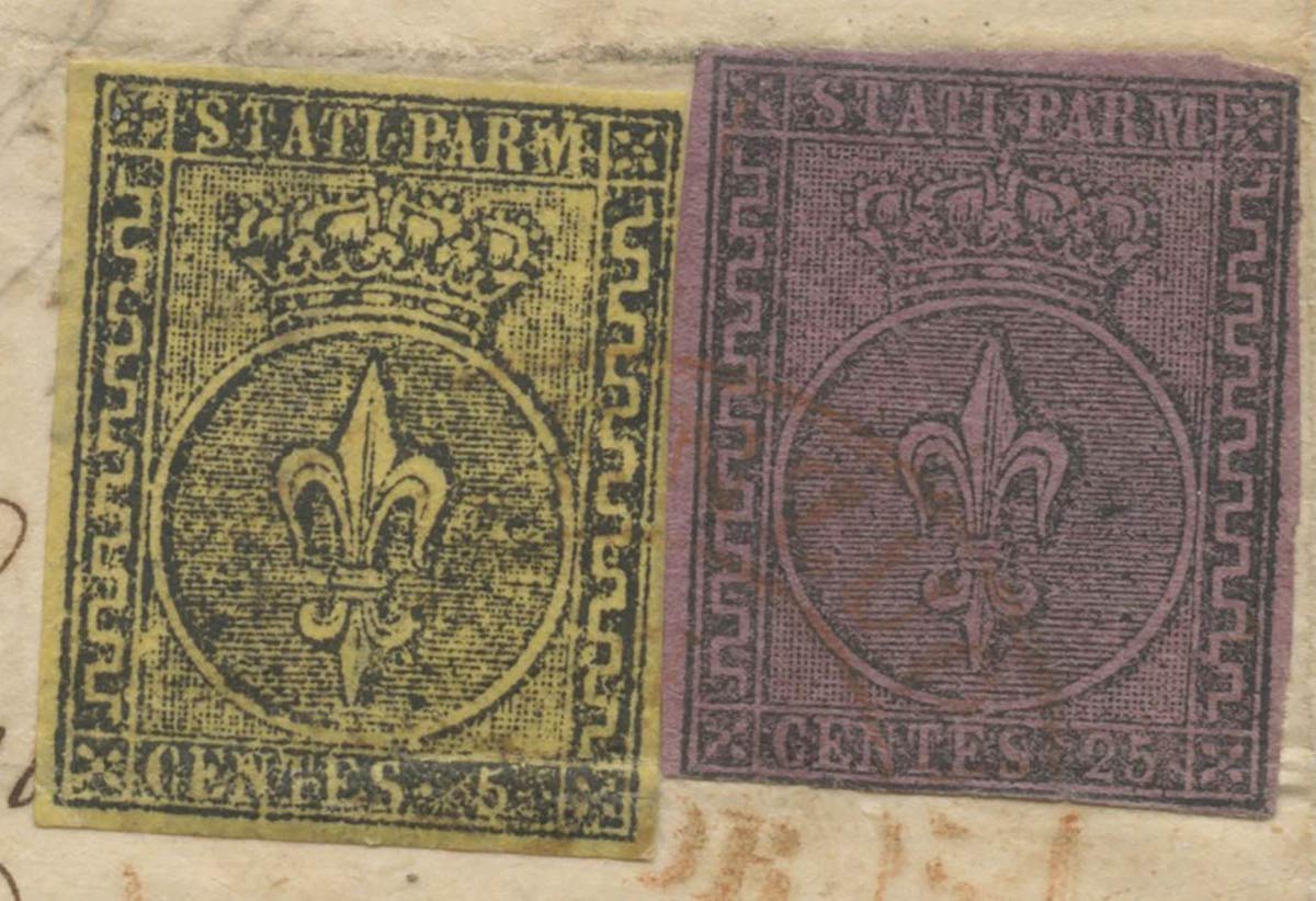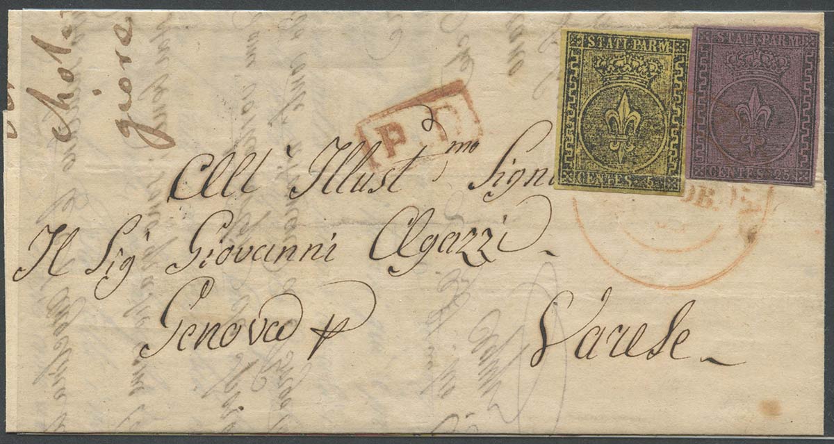 Lettera da Fiorenzuola per Varese affrancata per 30c. Tramite un 5c. N.1 Giallo Arancio e un 25c. N.4 Violetto. Sull'affrancatura il doppio cerchio in rosso di Fiorenzuola(5pt.). (B) (Cat.5.700)