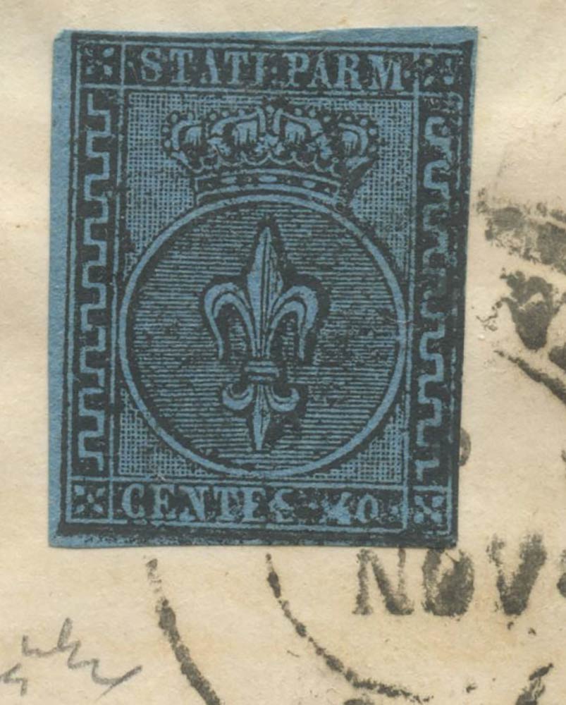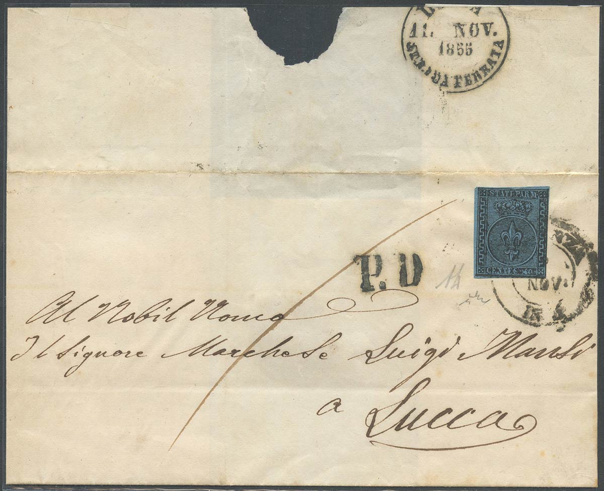 09.11.1855, lettera da Piacenza per Lucca affrancata con un 40c. (tariffa di 1° porto perla 3° distanza per lettere indirizzate nel Granducato di Toscana) di N.5 Azzurro, margini da buoni a sfiorati. (A-) (A. Diena, Chiavarello) (Cat.4.800)