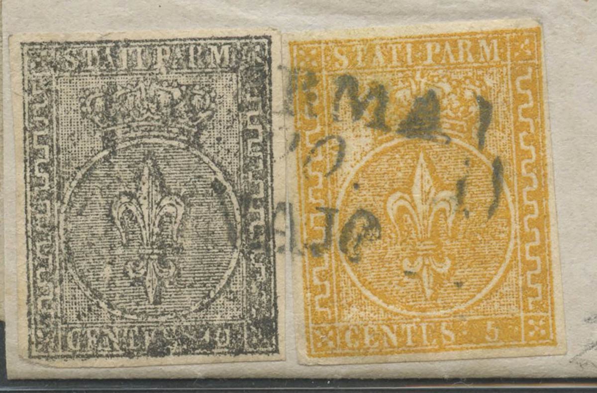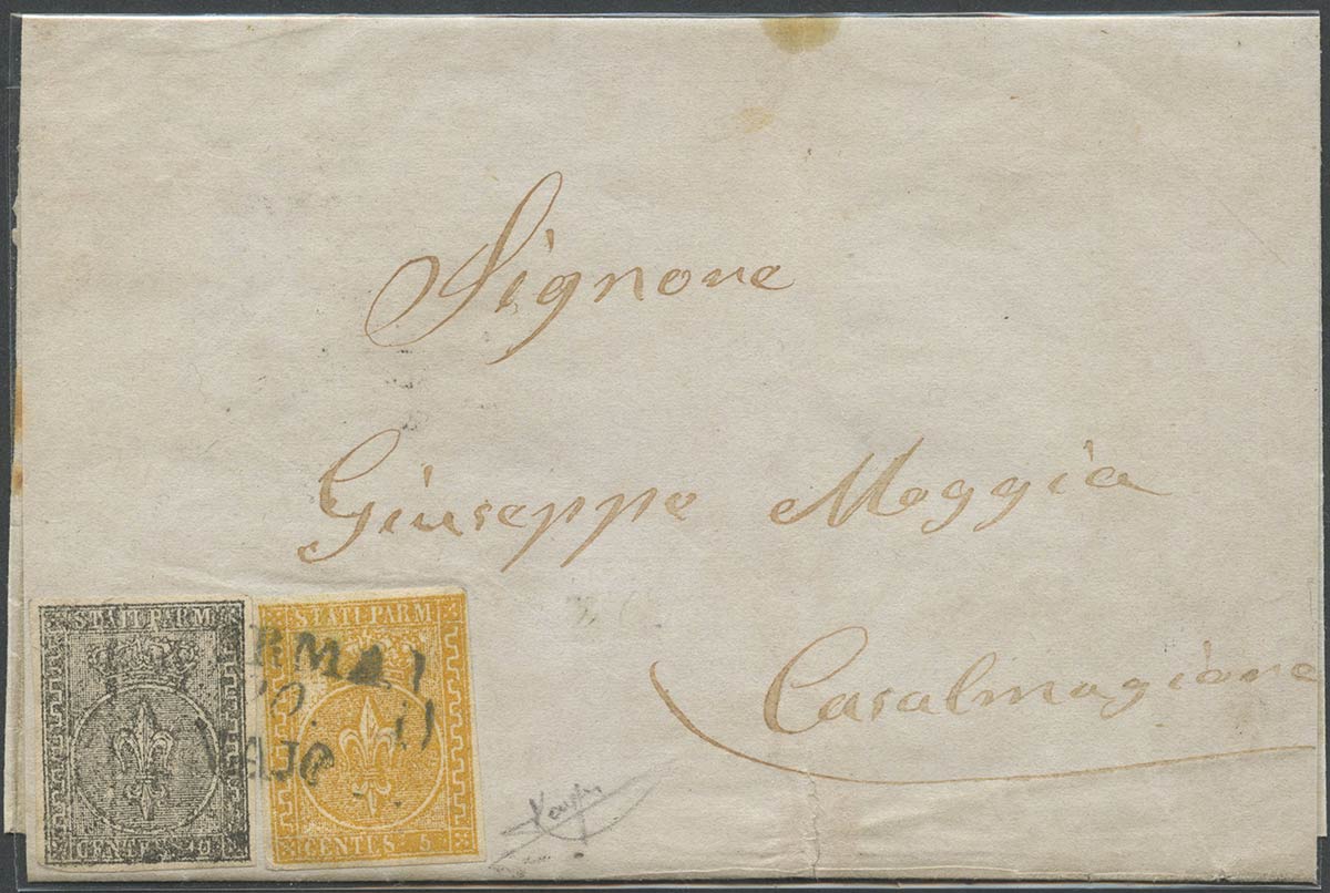 Lettera da Parma per Casalmaggiore affrancata per 15c. Tramite un 5c. N.6 Giallo Arancio e un 10c. N.2 Bianco, entrambi molto belli. Interessante affrancatura mista I°/II° emissione. (A+) (Raybaudi) (Cat.4.350++)
