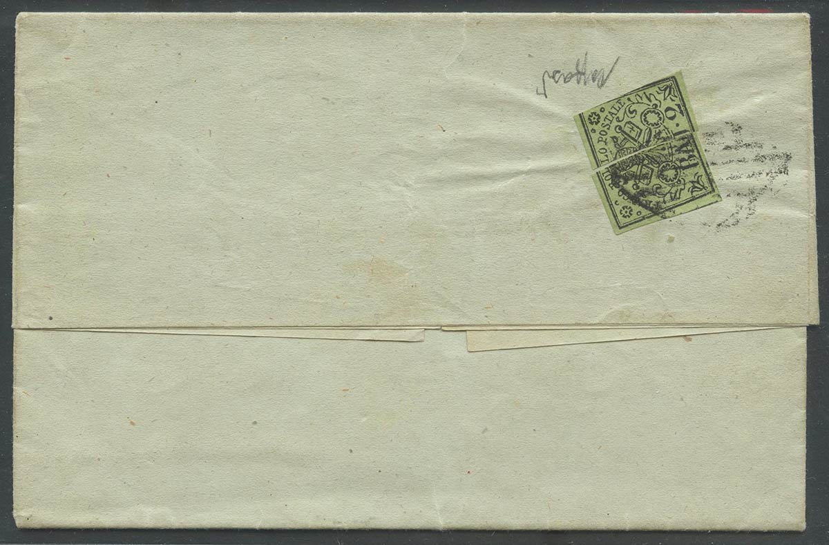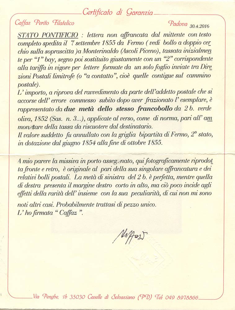 Lettera non affrancata spedita da Fermo a Monterinaldo, tassata erroneamente con il segno ''1'', tassazione assolta con un 2baj frazionato a metà. Tale tassazione venne poi corretta con il segno ''2'', corrispondente alla tariffa in quel momento in vigore per le lettere formate da un solo foglio inviate tra direzioni postali limitrofe (contigue sul cammino postale) ed assolta con l'altra metà dello stesso 2baj precedentemente utilizzato. Qualità (A/A-) (Cert. Caffaz) (Cat.--)