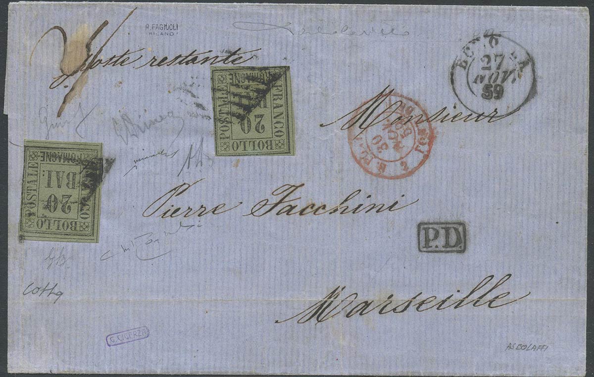 27.12.1859, lettera da Bologna per Marsiglia affrancata con due esemplari del...