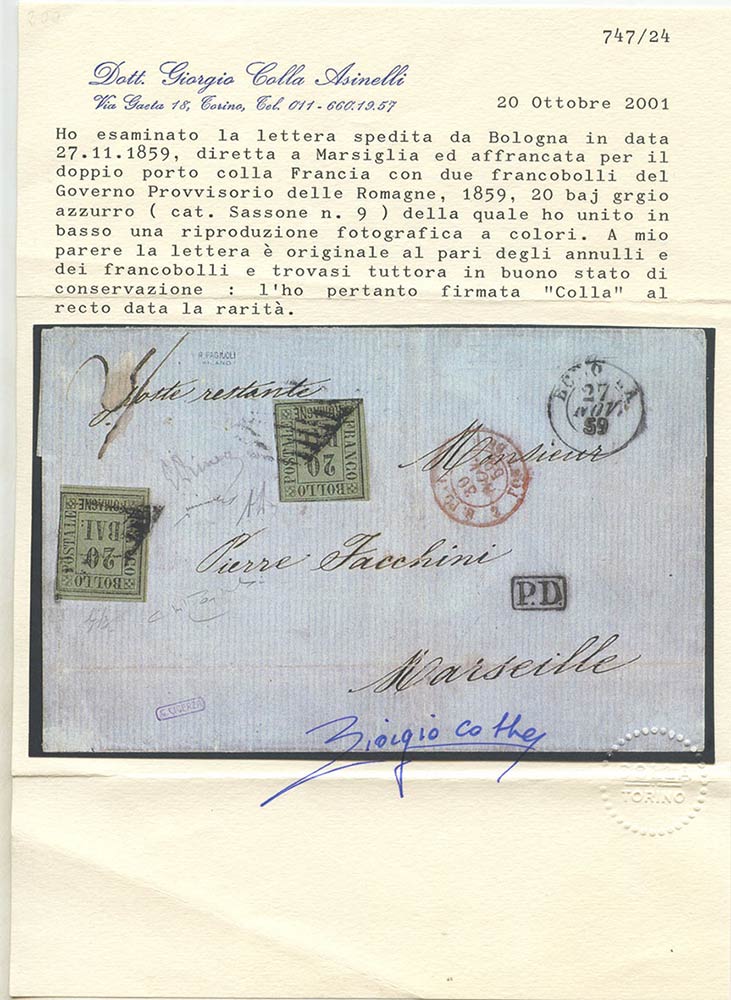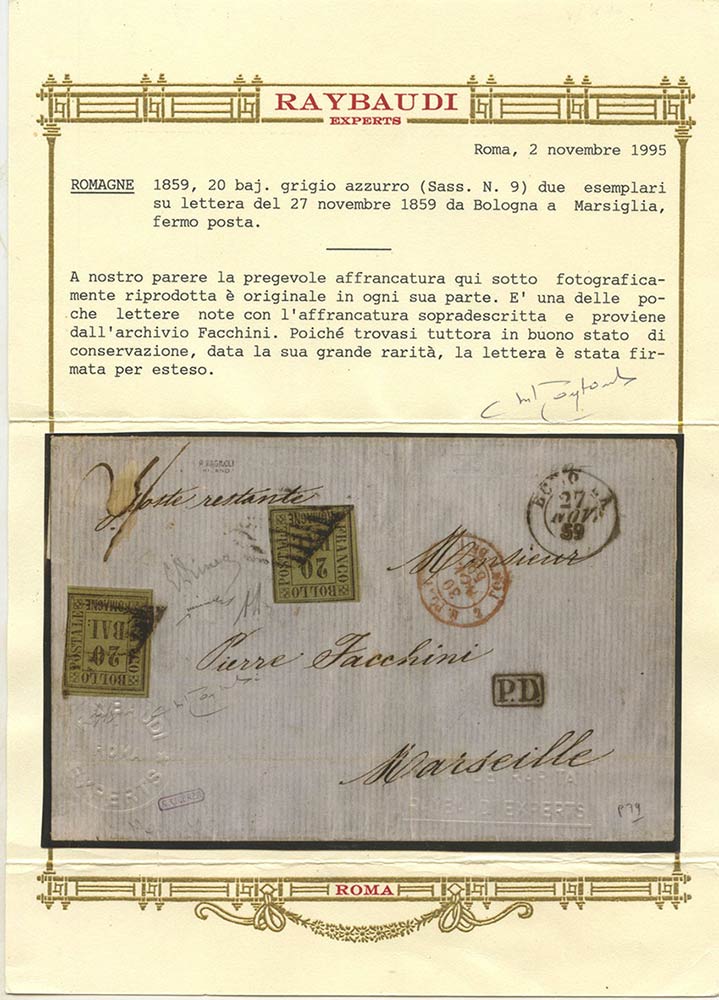 27.12.1859, lettera da Bologna per Marsiglia affrancata con due esemplari del 20b. N.9 Grigio Azzurro. (B) (Chiavarello, E. Diena, A.Diena, Biondi, Cardillo, Cert. Raybaudi, Cert. Colla) (Cat.90.000++)
