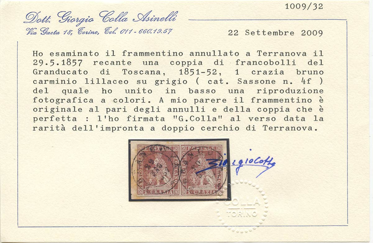 22.08.1855, 1cr. N.4f Bruno Carminio Lillaceo su Grigio in coppia su frammento. Annullo doppio cerchio di Terranova(R1). (A/A-) (Cert. Colla) (Cat.3800++)