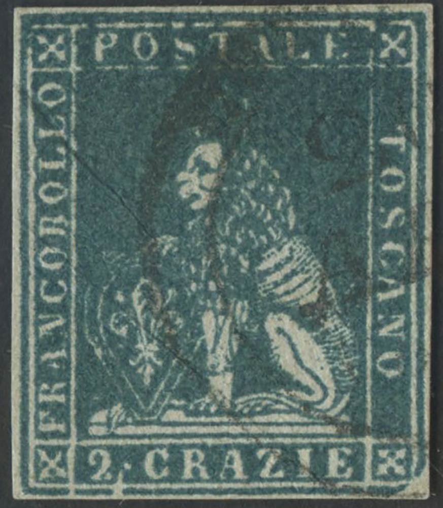 Lot 289 | 1851, 2cr. N.5e Azzurro verdastro su grigio, usato. Due grinze...